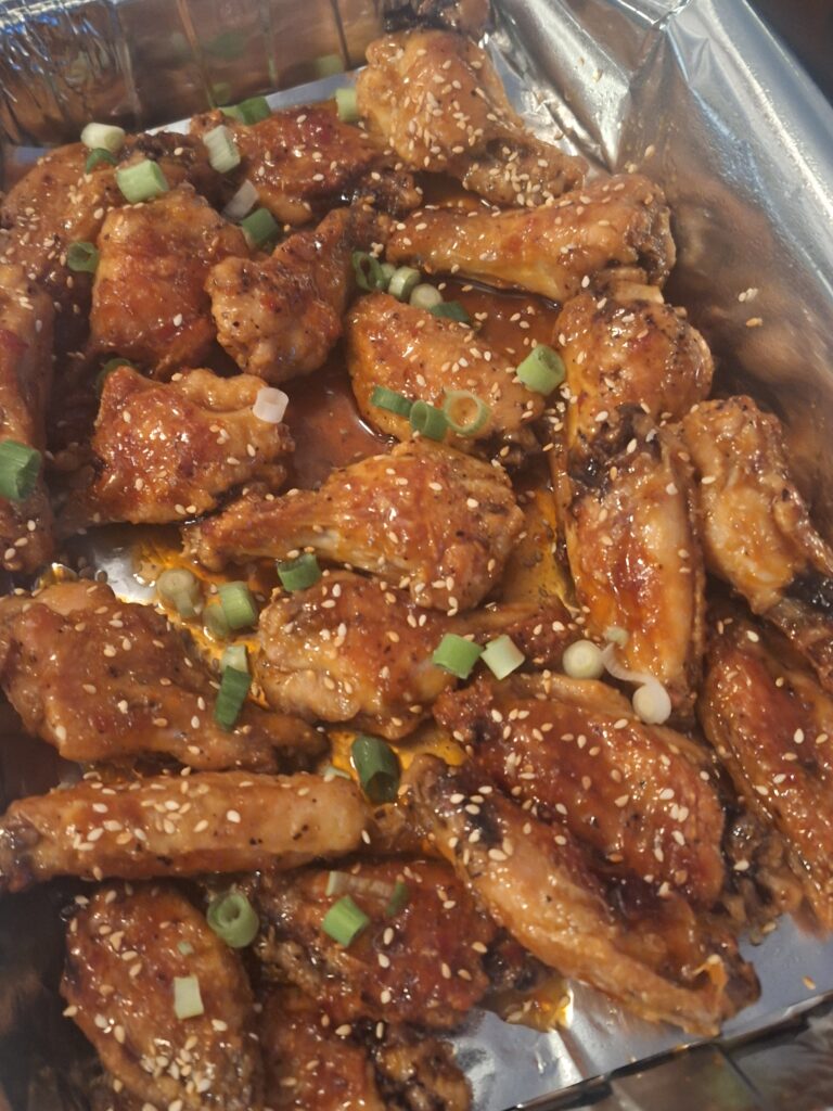 Start by coating the wings with the dry rub (above the sauce ingredients) and bake skin-side down at 350 F for 30 minutes. It’s most important, to rotate pan and flip wings and turn up the oven to 425 F for 30-40 minutes. Surely, you want crispy wings! When they are crispy and golden brown, take them out and put the wings in a large bowl. Then, pour the wing sauce over the wings and stir or toss to coat. Finally, serve them on a serving platter and sprinkle with toasted sesame seeds and chopped green onions.