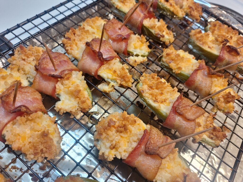 Firstly, cream together cream cheese, Sheri’s Pepper Jelly and Cheddar cheese. Next, prep the breading mixure in a cup and put aside. Then cut the Jalepenos in ½ and de-seed. Fill jalepeno halves with the cream mixture, top with the breading, wrap each with a ½ piece of bacon and secure with a toothpick. Bake at 375 degrees for 30 minutes.