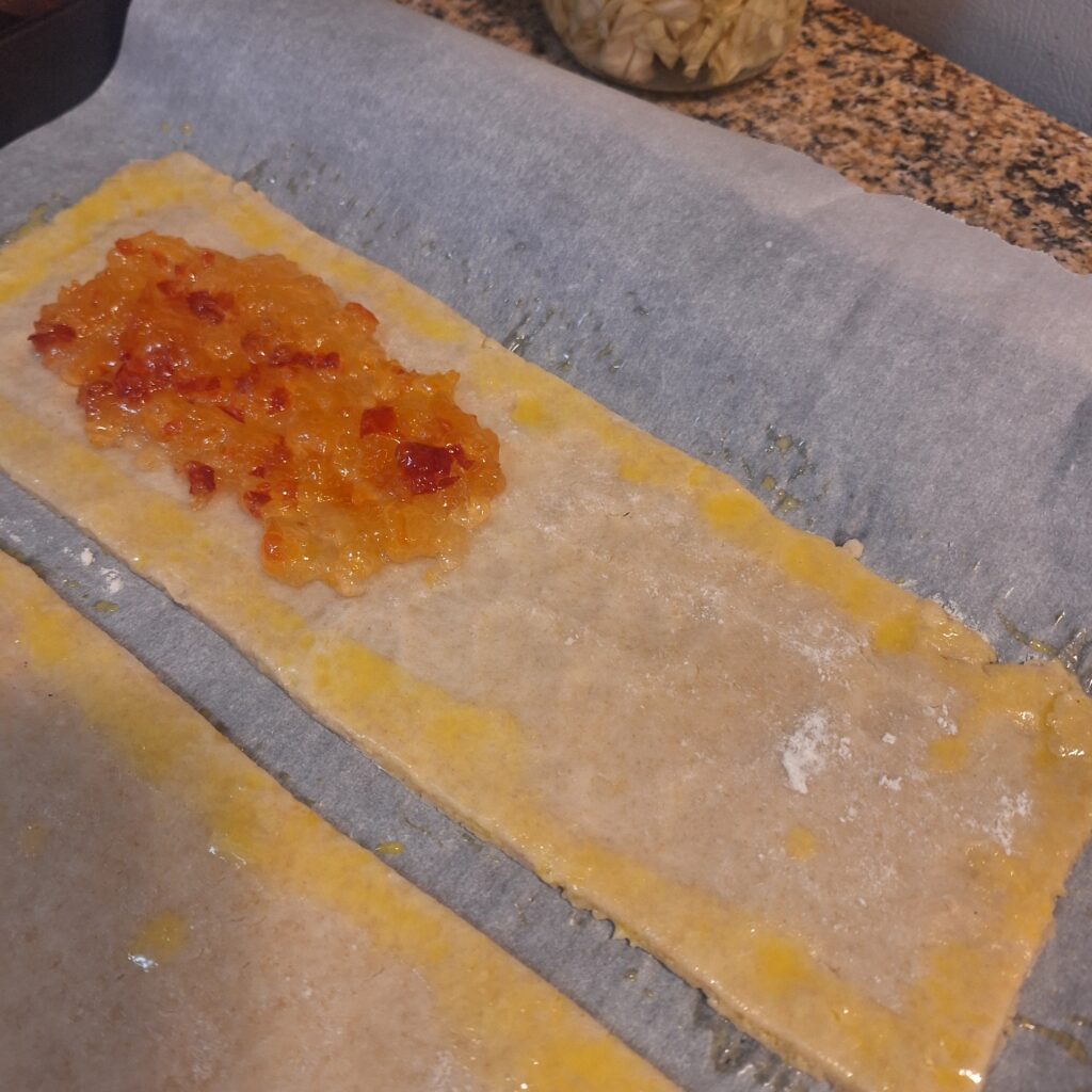- Roll the dough into a rectangle with a 1/8″ thickness, on a lightly floured surface. Cut the dough into 4 long strips and brush the edges with egg wash.